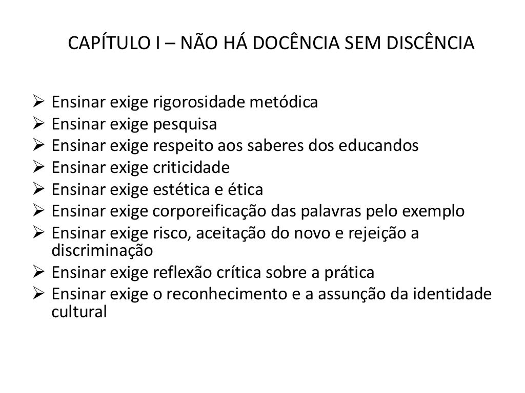 No segundo capítulo, Freire vai mais a fundo e disseca essa frase acima. Ele é condicionado a estimular a vontade dos alunos em aprender. E assim, essa troca se torna perene. Sendo assim, o ensinar preza por uma tolerância e entendimento do educador do meio onde vive. Muitas vezes, o professor desdenha dos alunos por causa do lugar onde vivem ou a origem social. Ele critica o fatalismo que é dado como fato consumado às pessoas mais desfavorecidas. Lore Ferrer. Ricardo Plaul. Laren, Apple, Giroux, Freire y otros. Ingrid Cedeño Quesada. Ricardo O. Fernando Ignacio García Donoso.